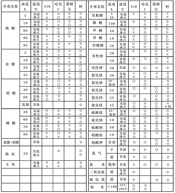 ☆ 耐腐蝕性好的材料 ○ 尚耐腐蝕的材料 × 不耐腐蝕的材料